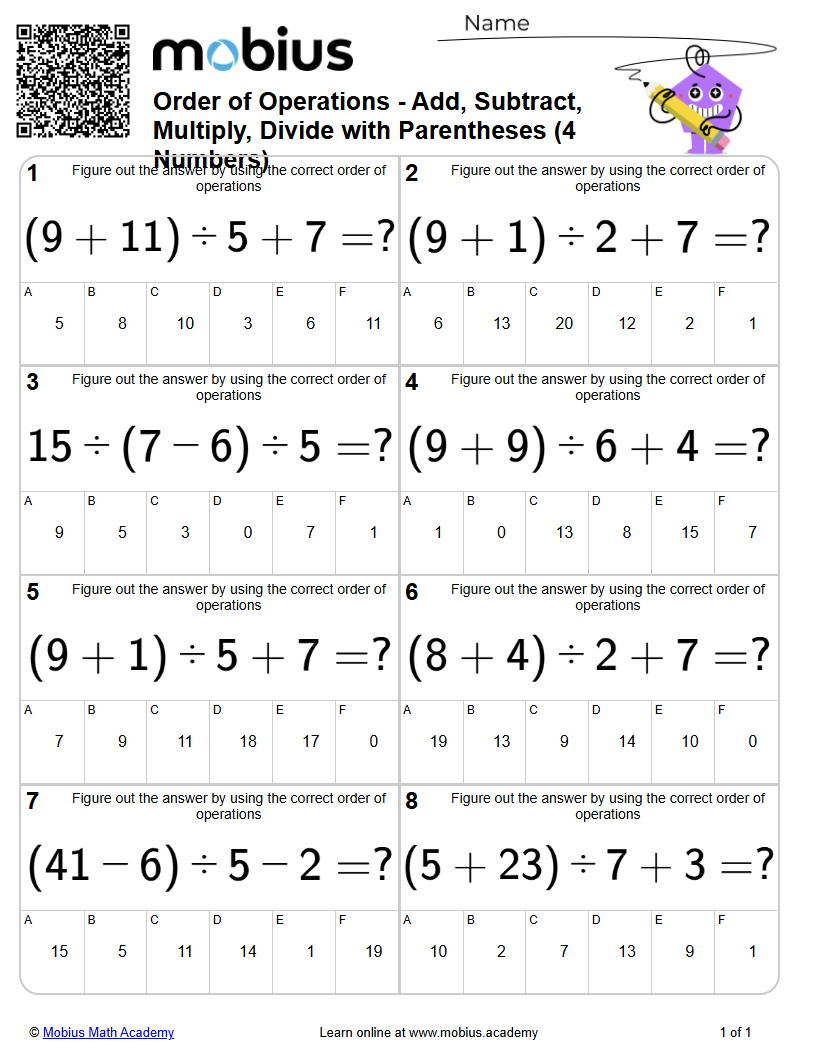 Order of Operations - Add, Subtract, Multiply, Divide with Parentheses ...