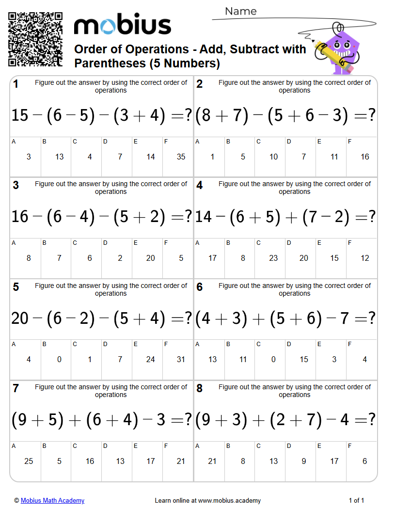 Order of Operations - Add, Subtract with Parentheses (5 Numbers) (Level ...