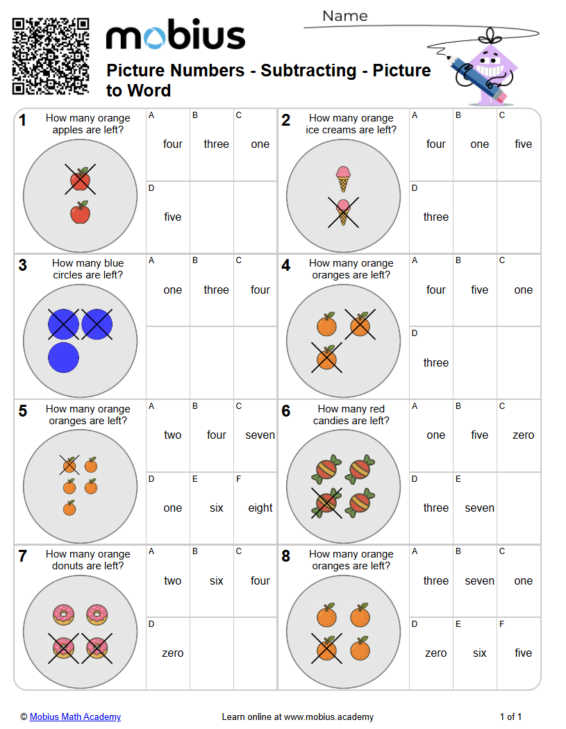 Picture Numbers - Subtracting - Picture to Word (Level 1) - Mobius Math ...