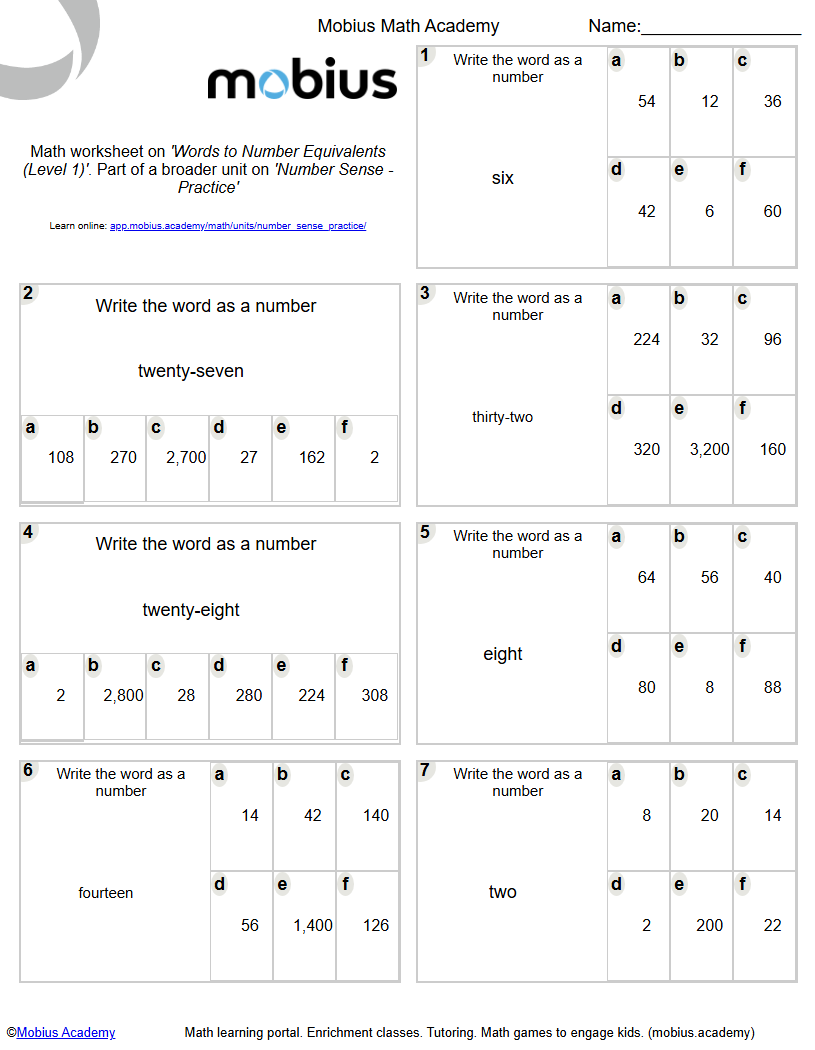 Words to Number Equivalents (Level 1) - Mobius Math Academy