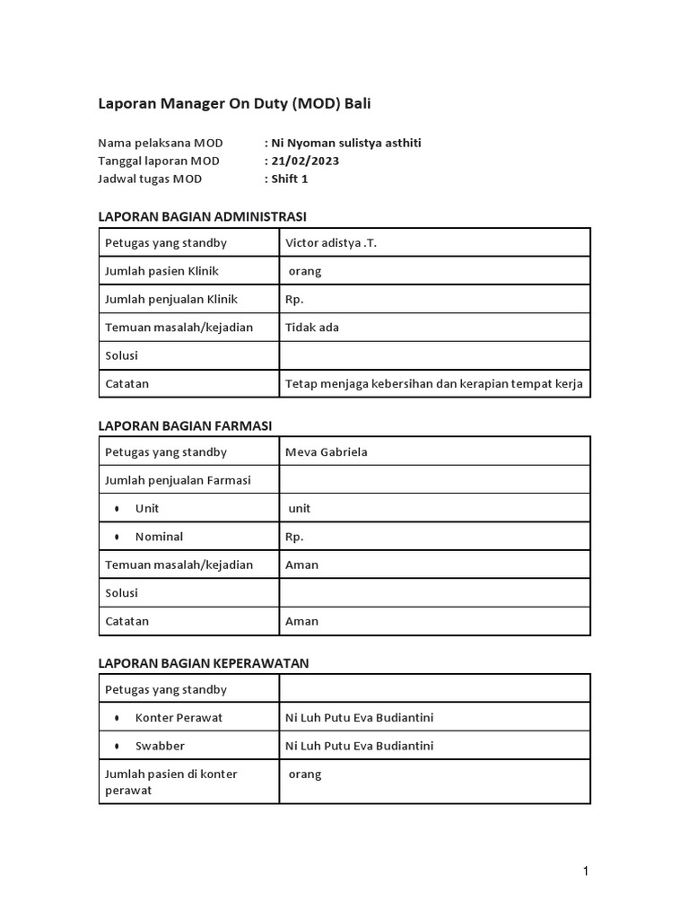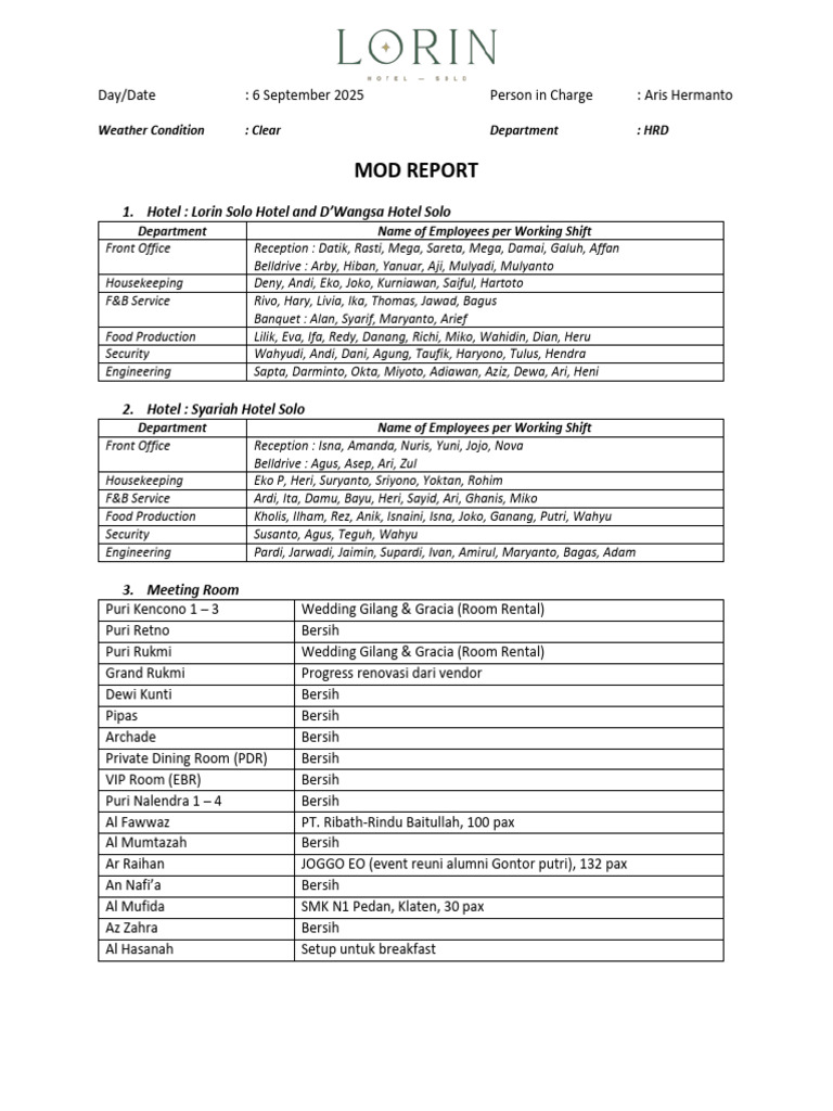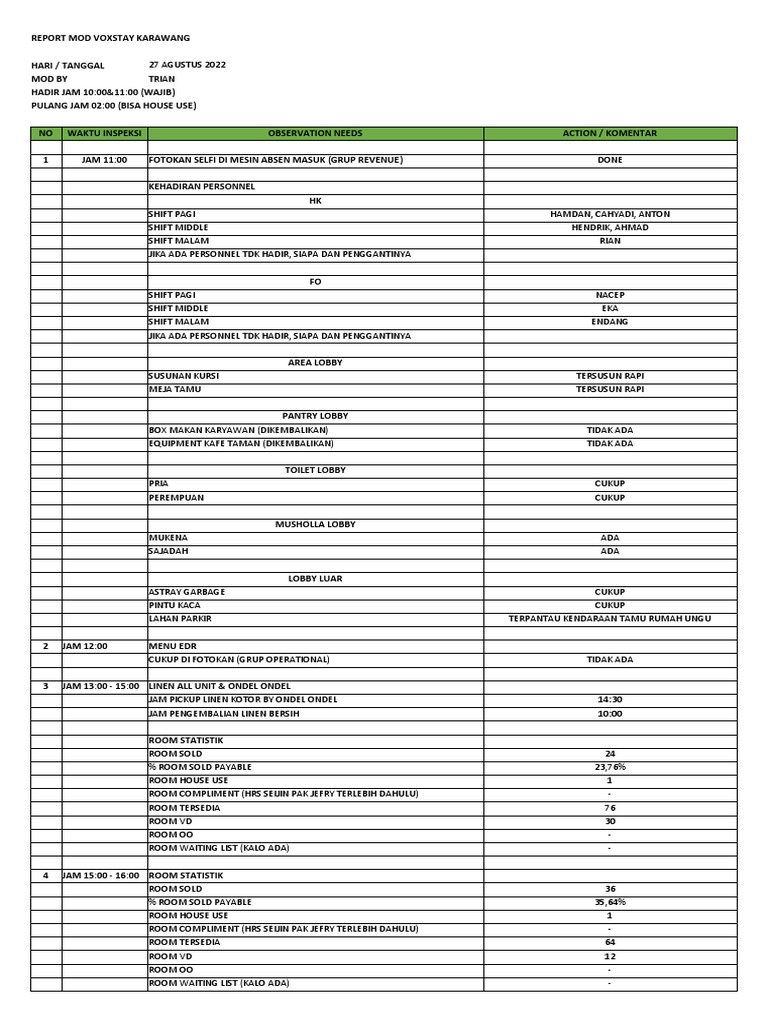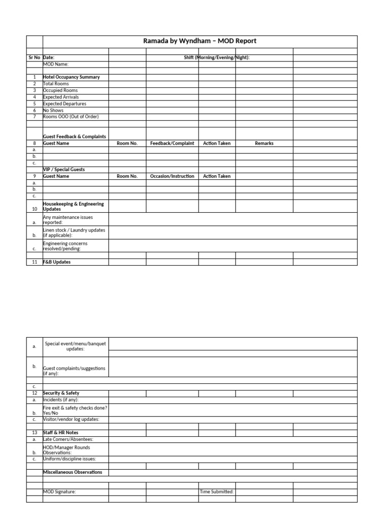 Manager on Duty Report | Hotel MOD Report Sample | Night Manager Report ...
