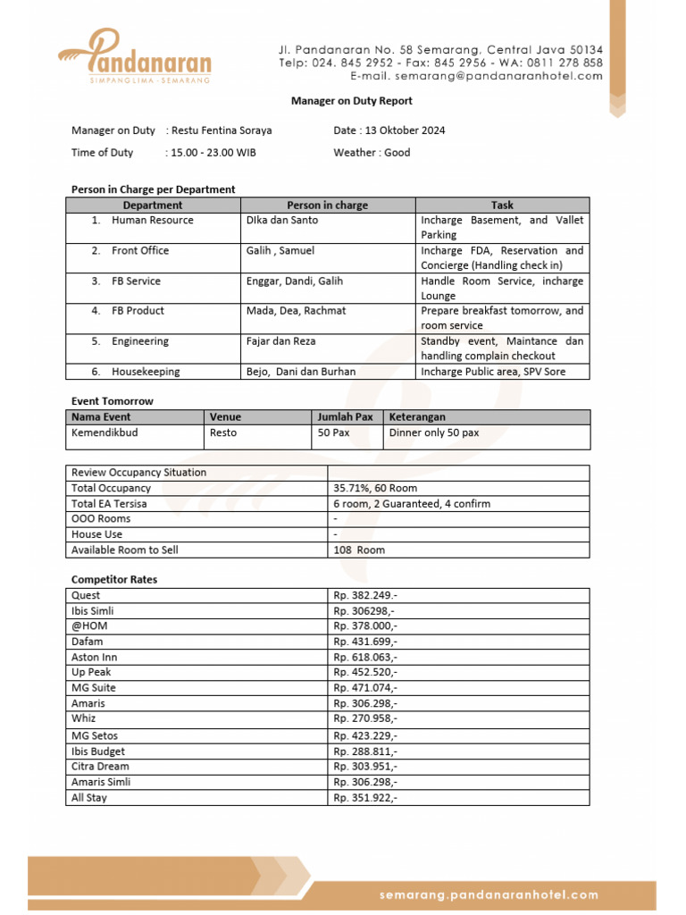 Manager on duty report - Hotel Logo and Name setupmyhotel.com Manger on ...