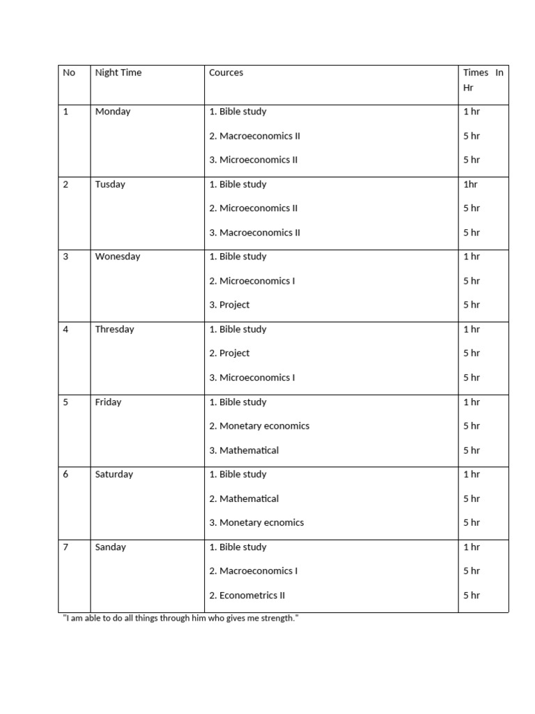 Weekly Study Schedule Overview | PDF | Wellness