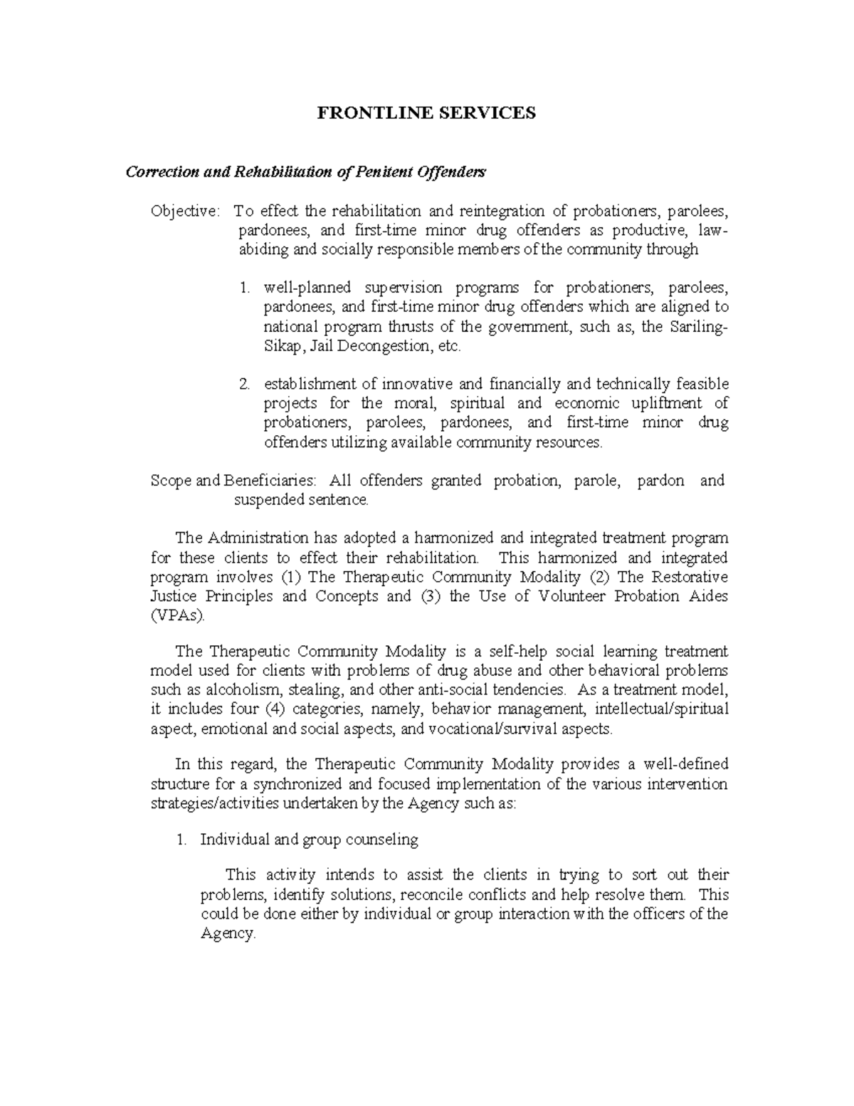 FRONTLINE SERVICES: Therapeutic Community Modality for Offender Rehab ...