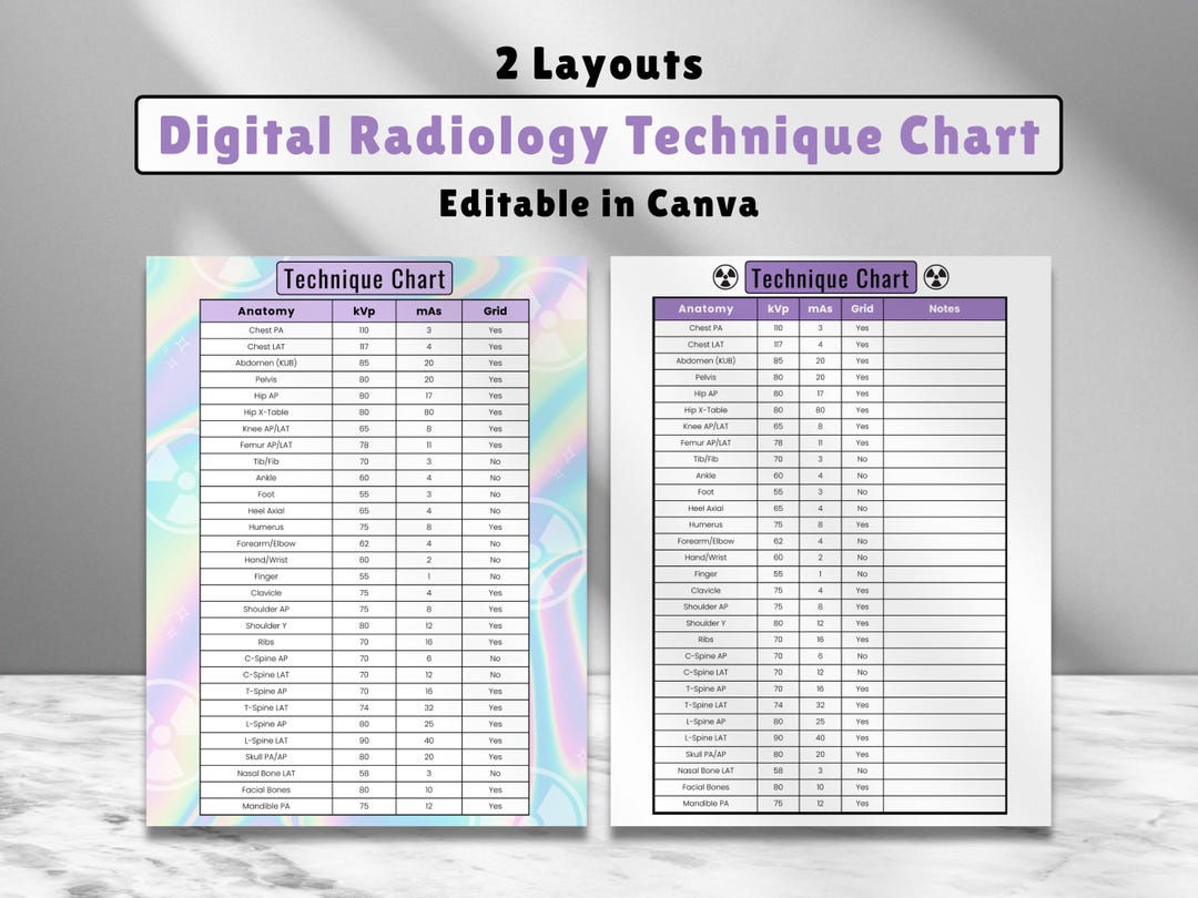 Radiology Technique Chart Printable, Xray Study Guide for Rad Tech ...