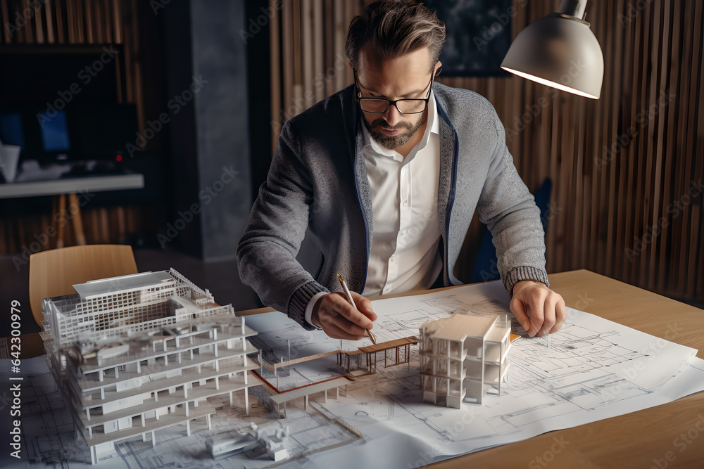 Professional male architect looking at a 3D printed model of a real ...