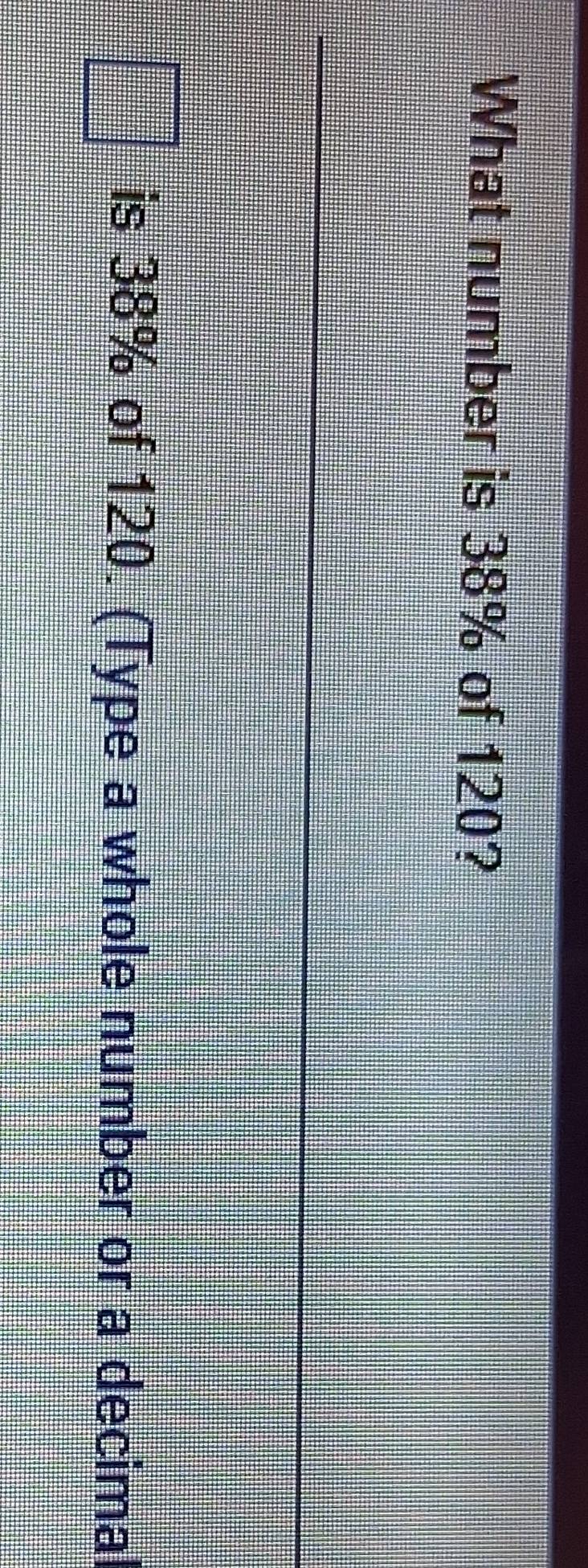 Solved: What number is 38% of 120? is 38% of 120. (Type a whole number ...