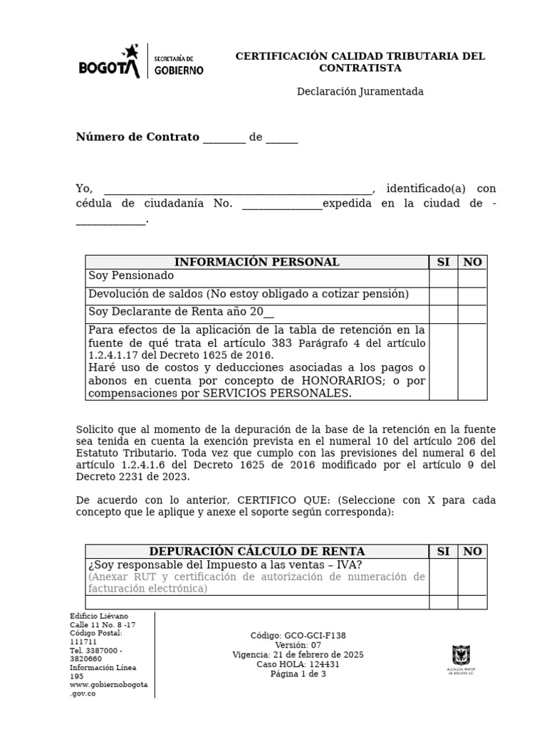 Gco-Gci-F138 - v7 CERTIFICACION CALIDAD TRIBUTARIA DEL CONTRATISTA | PDF