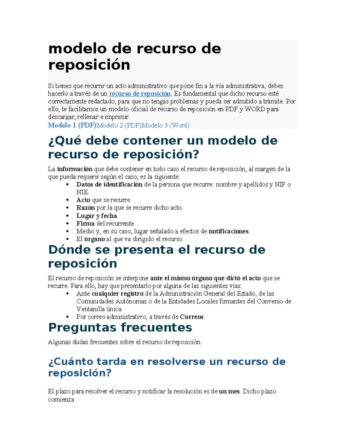 Modelo de Recurso de Reposición para Actos Administrativos - Studocu