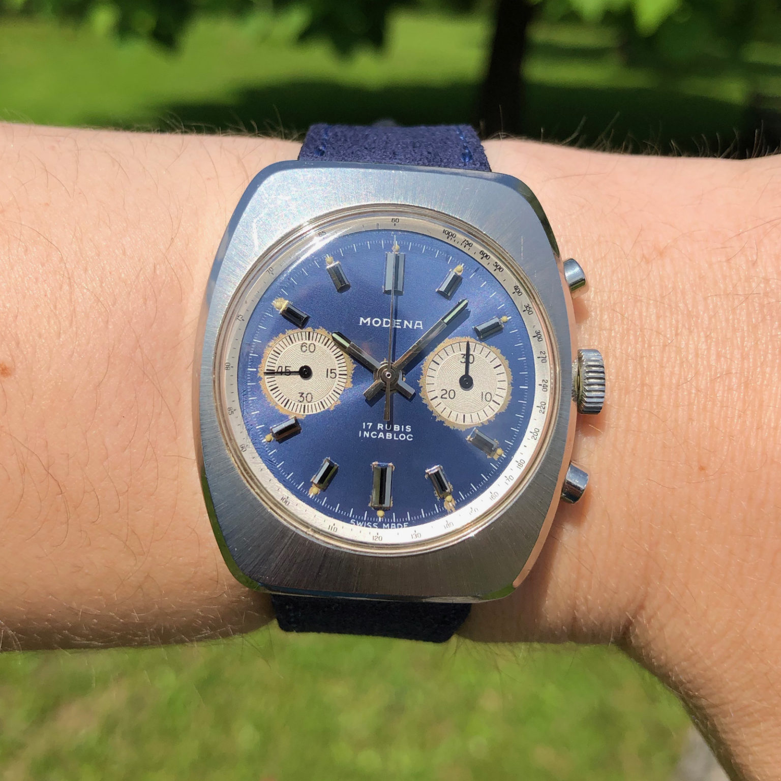 Vintage steel chronograph “Modena” blue dial – Brussels Vintage Watches