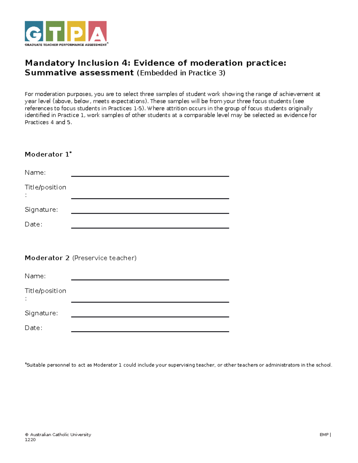 Evidence of Moderation Practice (Placement) - Mandatory Inclusion 4 ...