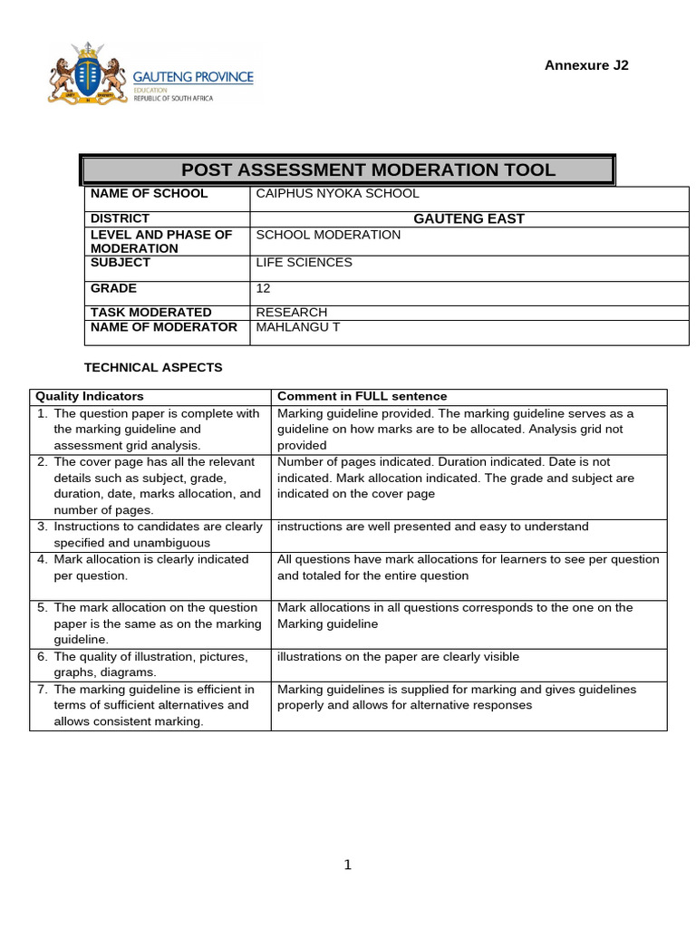 J2 Moderation Form for Life Sciences | PDF | Teachers | Validity ...