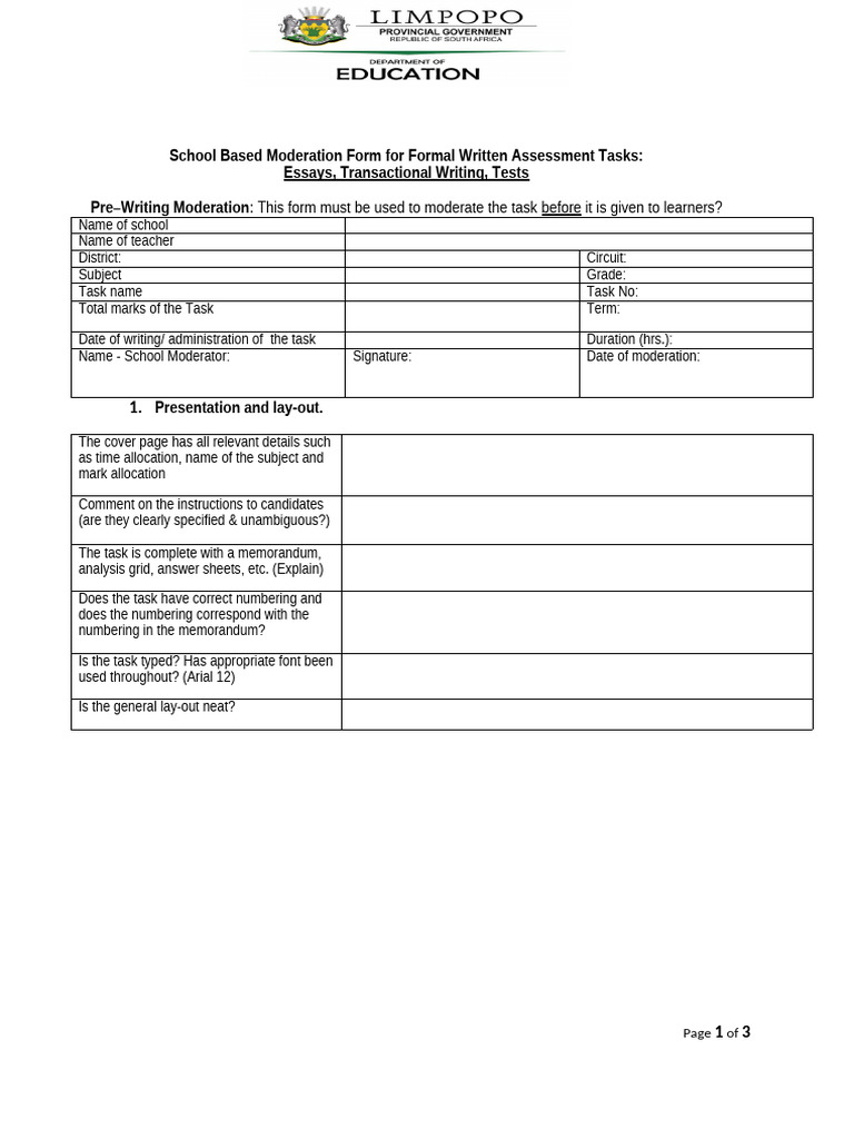 School Based Moderation Form For Formal Written Assessment Tasks We.f ...