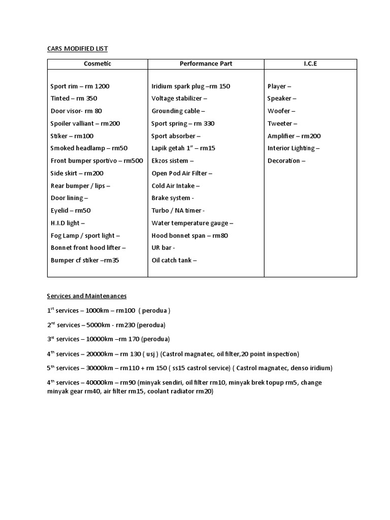 Car Modification and Service List | PDF