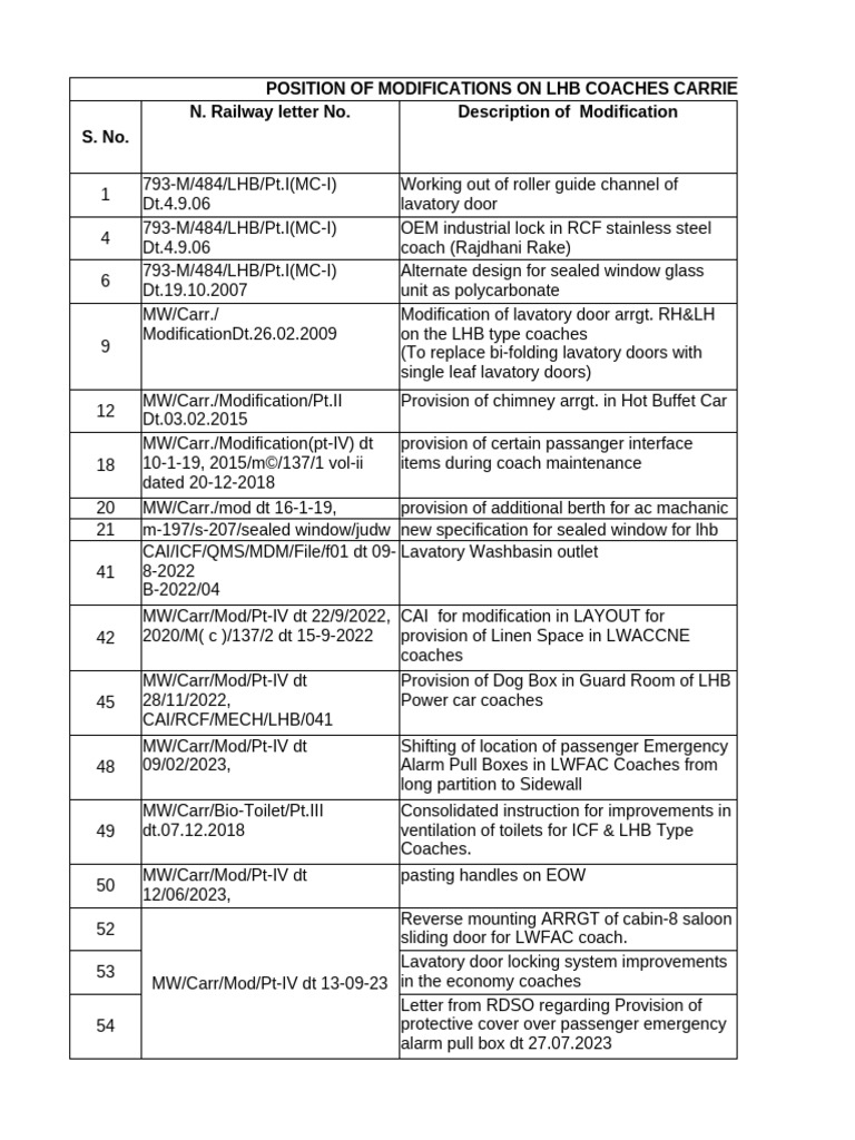 LHB Modification list | PDF | Rail Transport | Rolling Stock