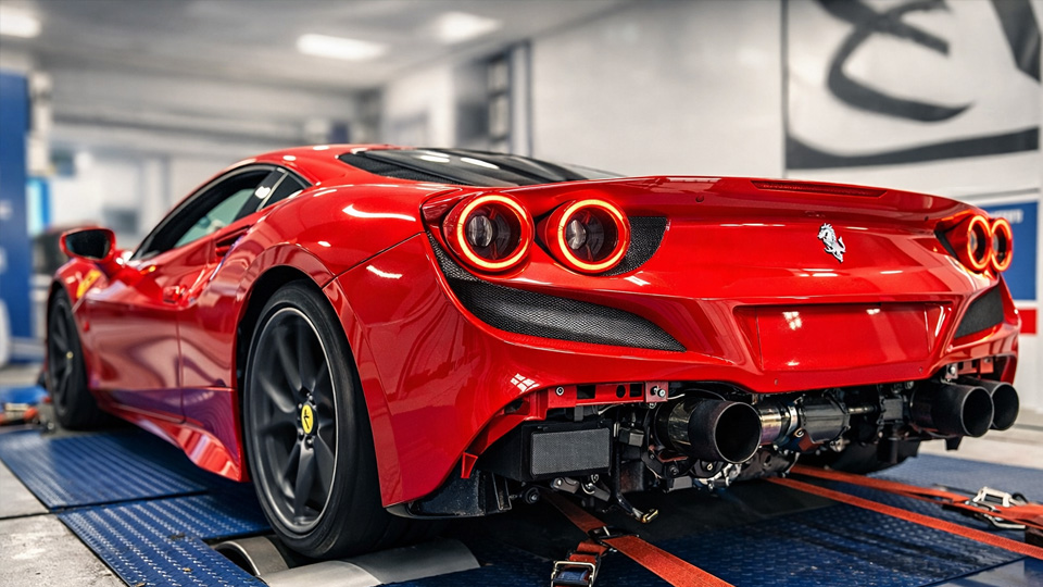 Testing a modified Ferrari F8 Tributo on the dyno