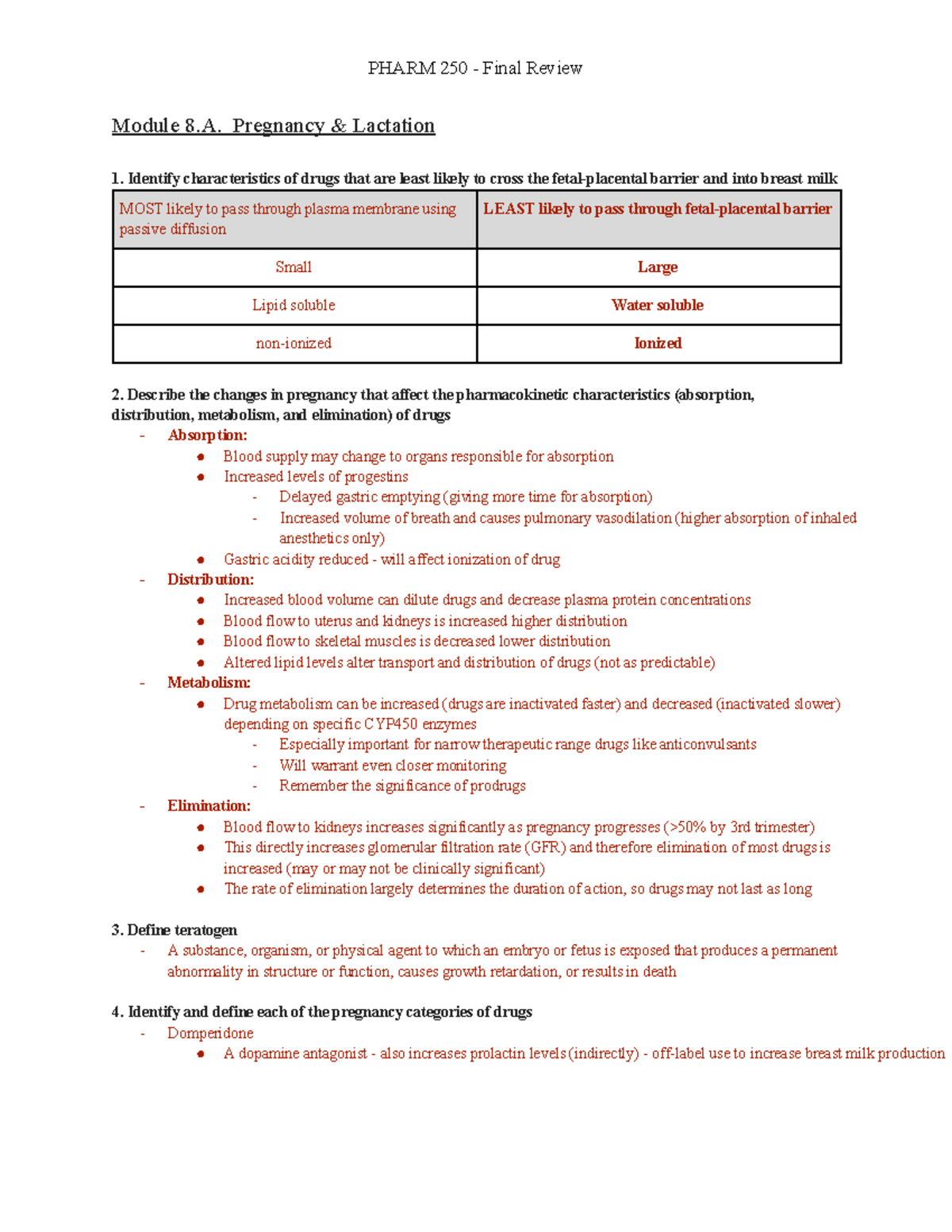 250 - Module 8 - Module 8. Pregnancy & Lactation 1. Identify ...