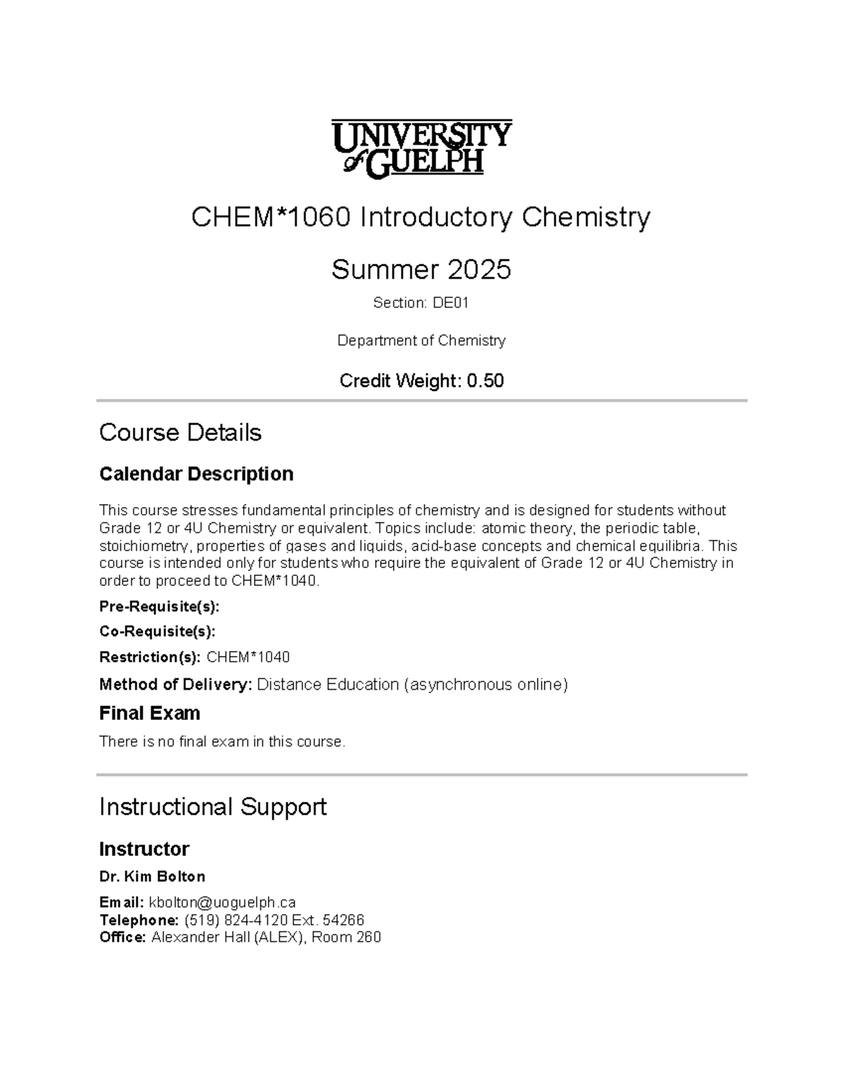 Chem1060 Introductory Chemistry Course Outline - Summer 2025 - Studocu