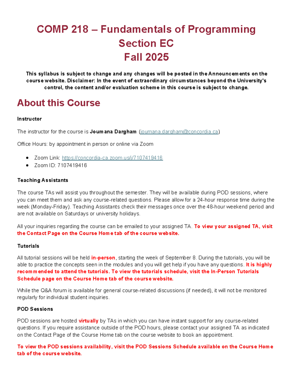 COMP 218 Course Outline: Fundamentals of Programming Fall 2025 - Studocu