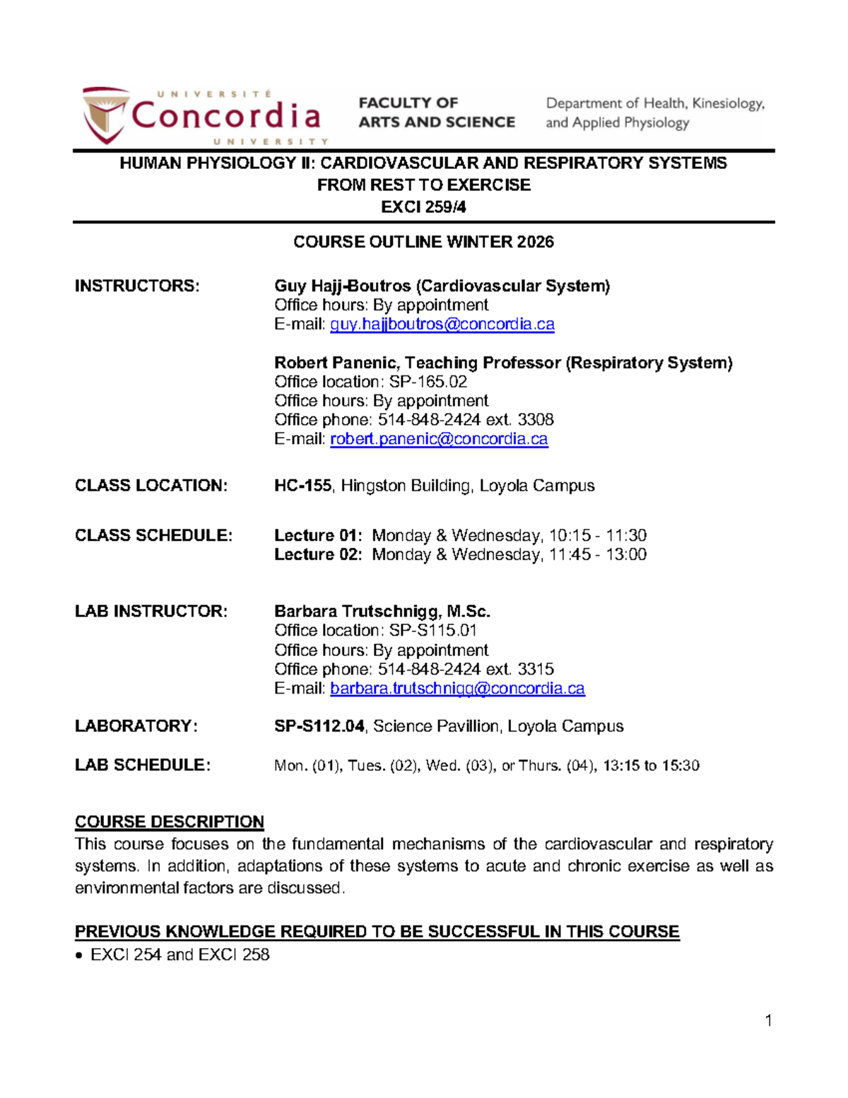 EXCI 259: Course Outline for Human Physiology II - Winter 2026 - Studocu