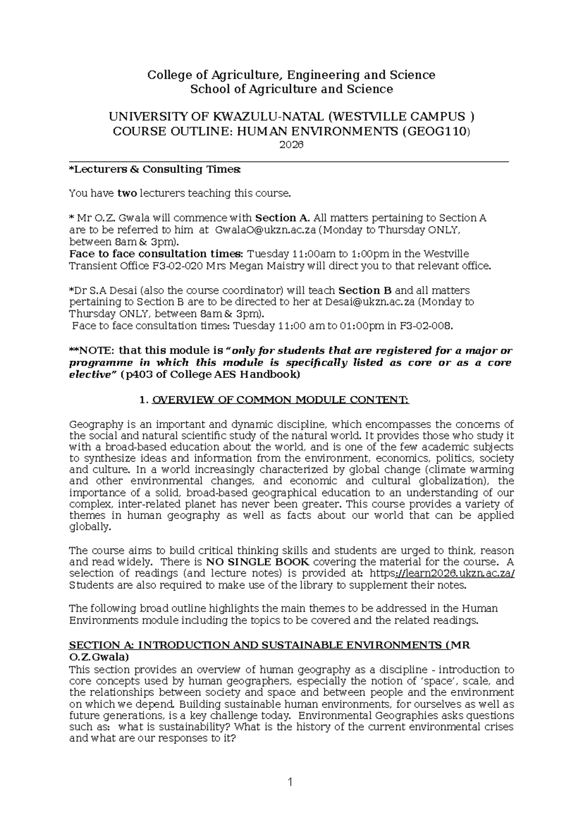Course Outline: Human Environments (GEOG110) - Westville Campus 2026 ...
