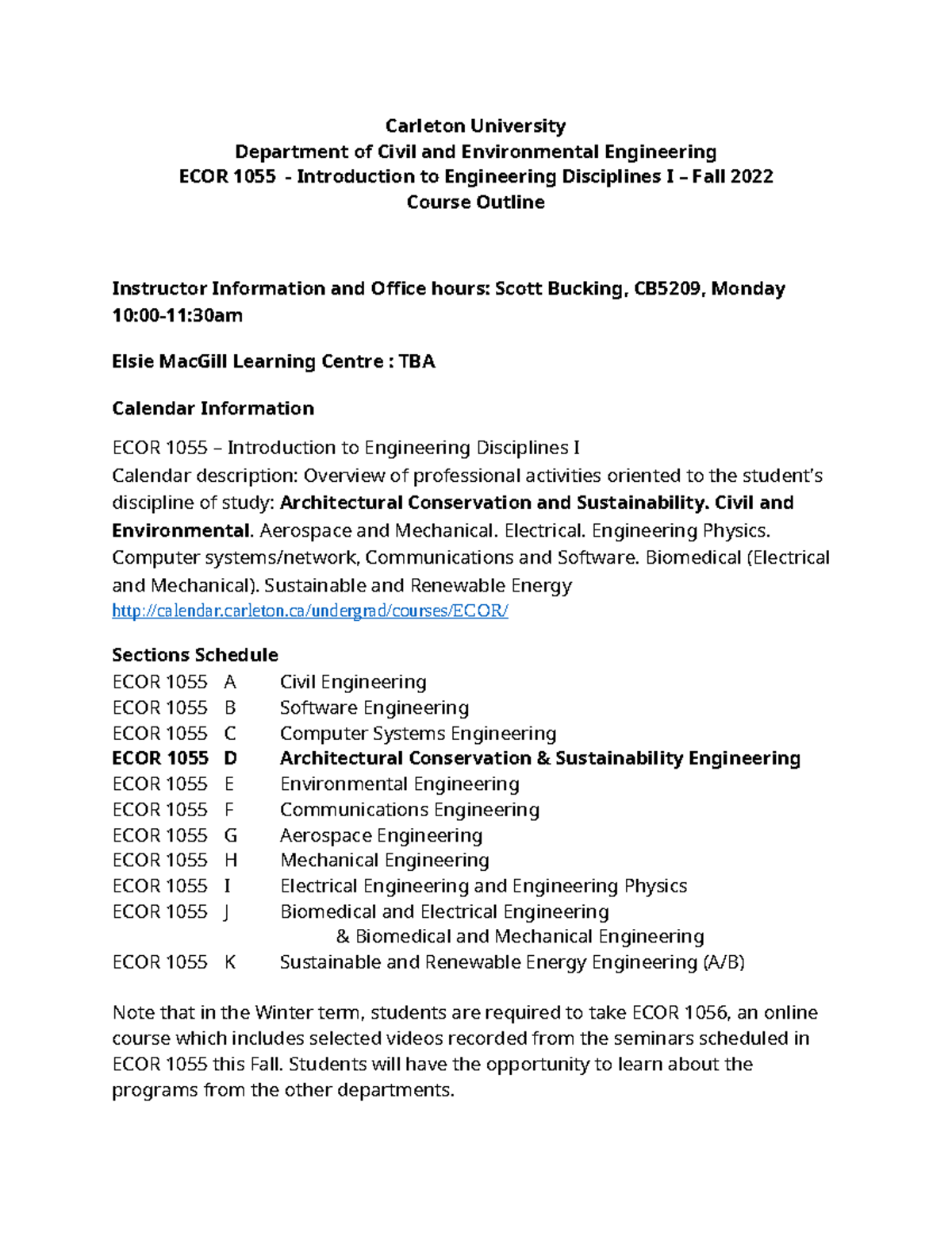ECOR 1055 Fall 2022 Course Outline: Intro to Engineering Disciplines ...