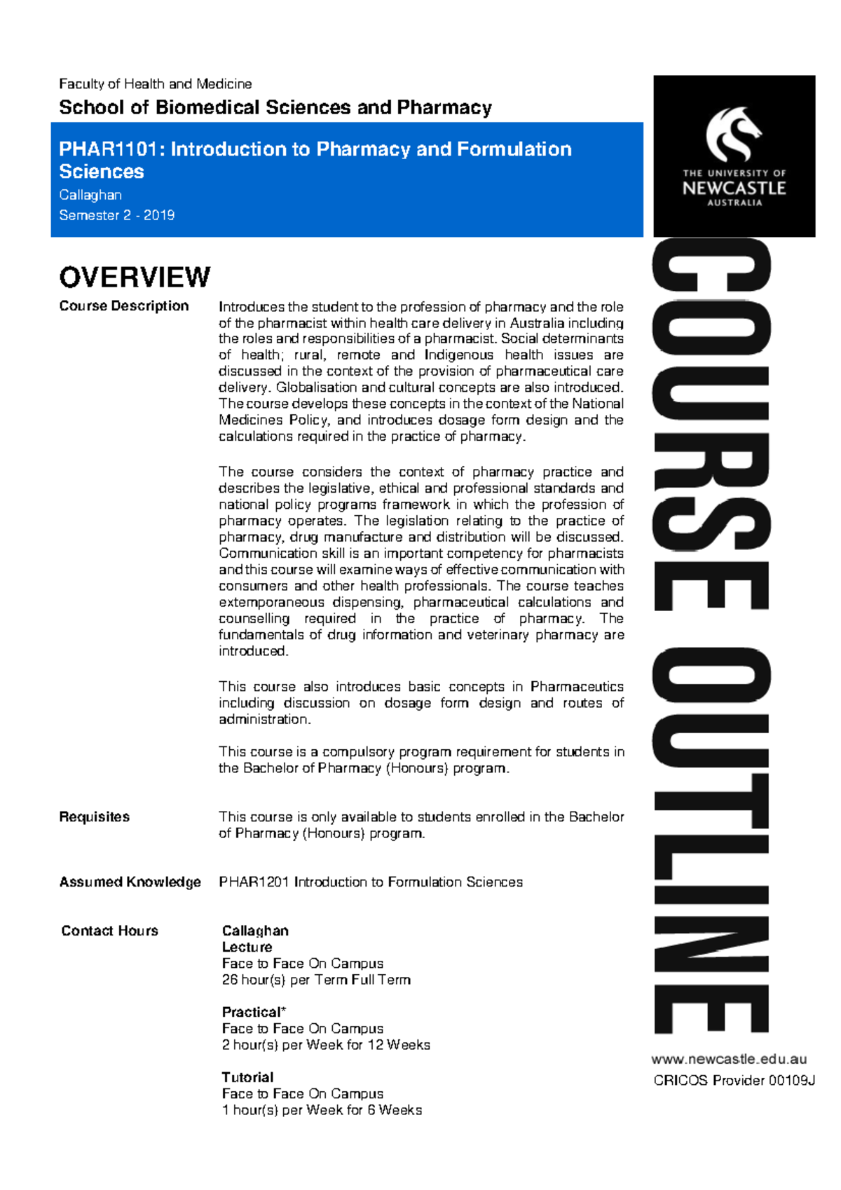 PHAR1101: Course Outline for Introduction to Pharmacy & Formulation ...