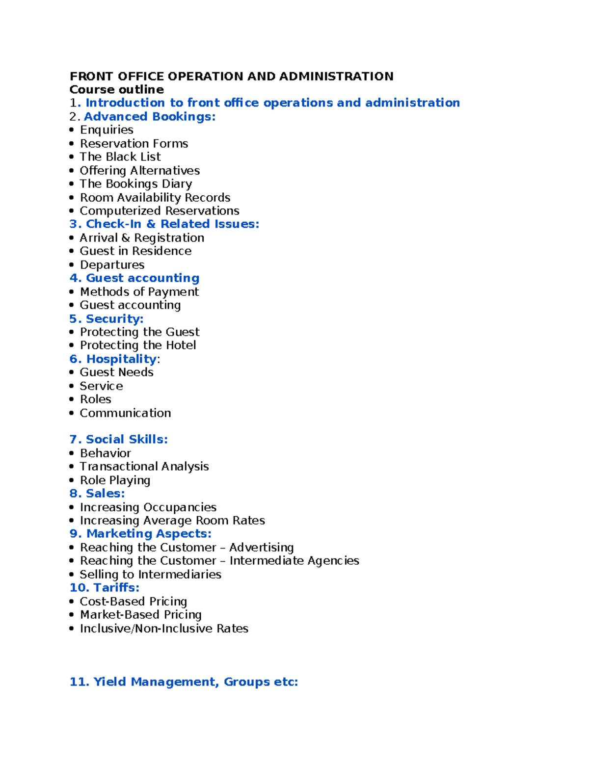 FRONT OFFICE OPERATION AND ADMINISTRATION Course Outline - Studocu