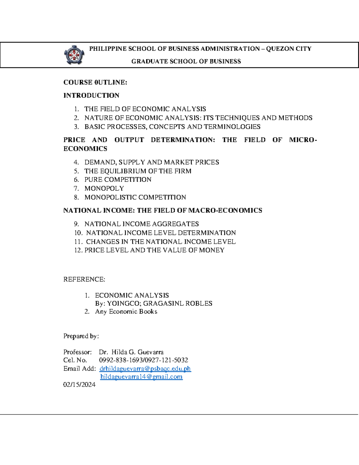 ECON 101: Economic Analysis Course Outline - 2nd Sem 2023-24 - Studocu