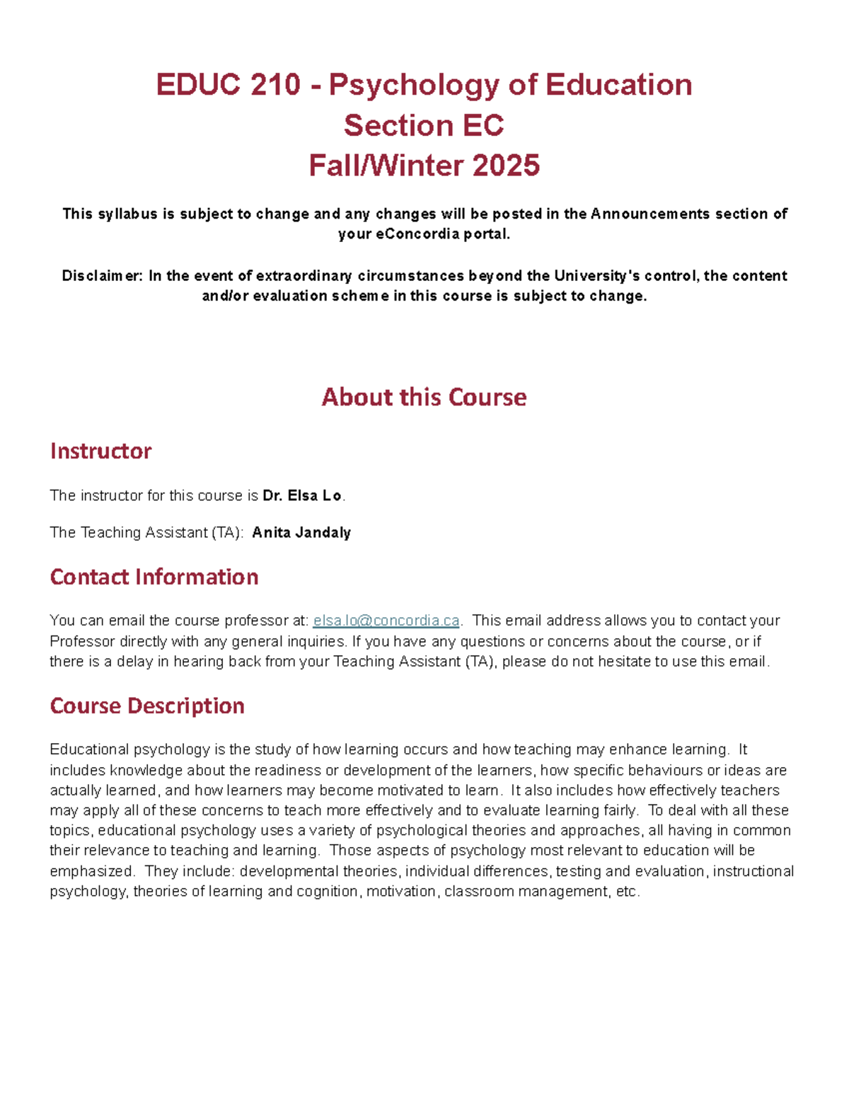 EDUC 210 Course Outline: Psychology of Learning & Teaching - Studocu