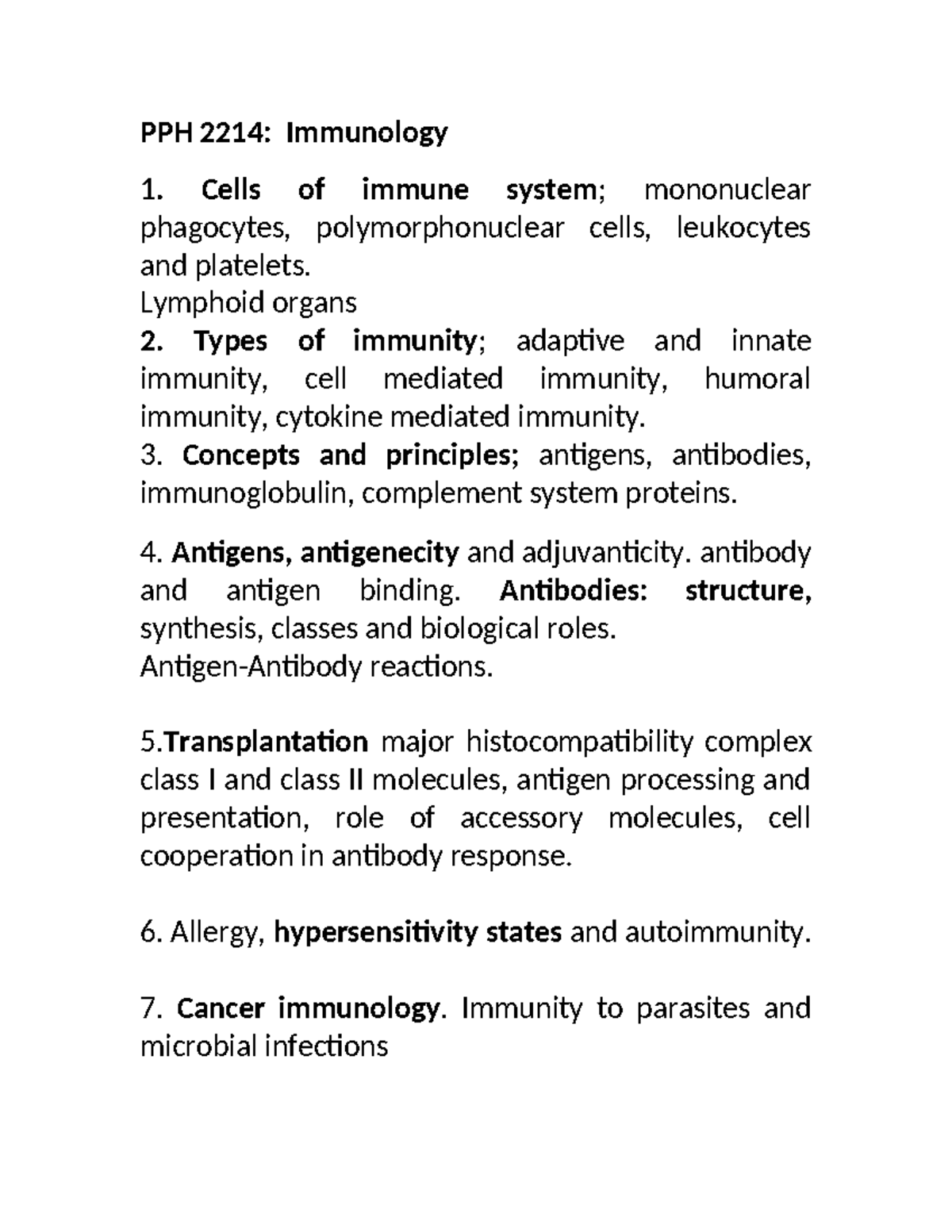 PPH 2214: Immunology Course Outline and Key Concepts - Studocu