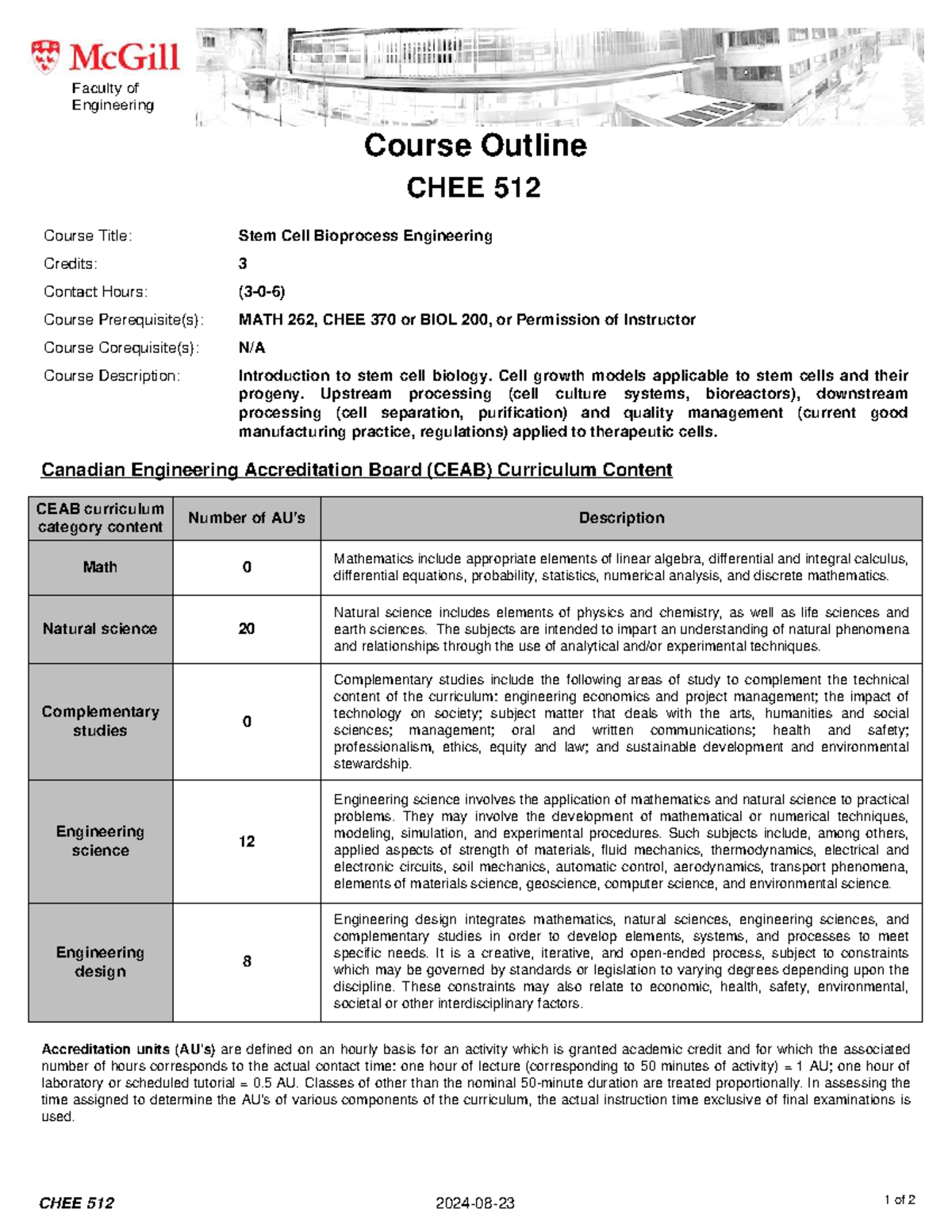 CHEE 512 Course Outline: Stem Cell Bioprocess Engineering Overview ...