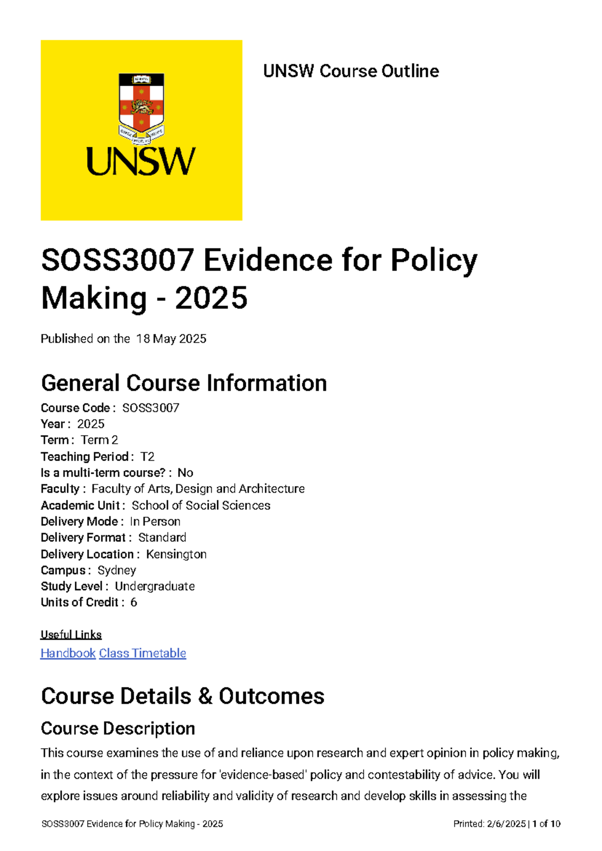 SOSS3007 Course Outline: Evidence for Policy Making T2 2025 - Studocu