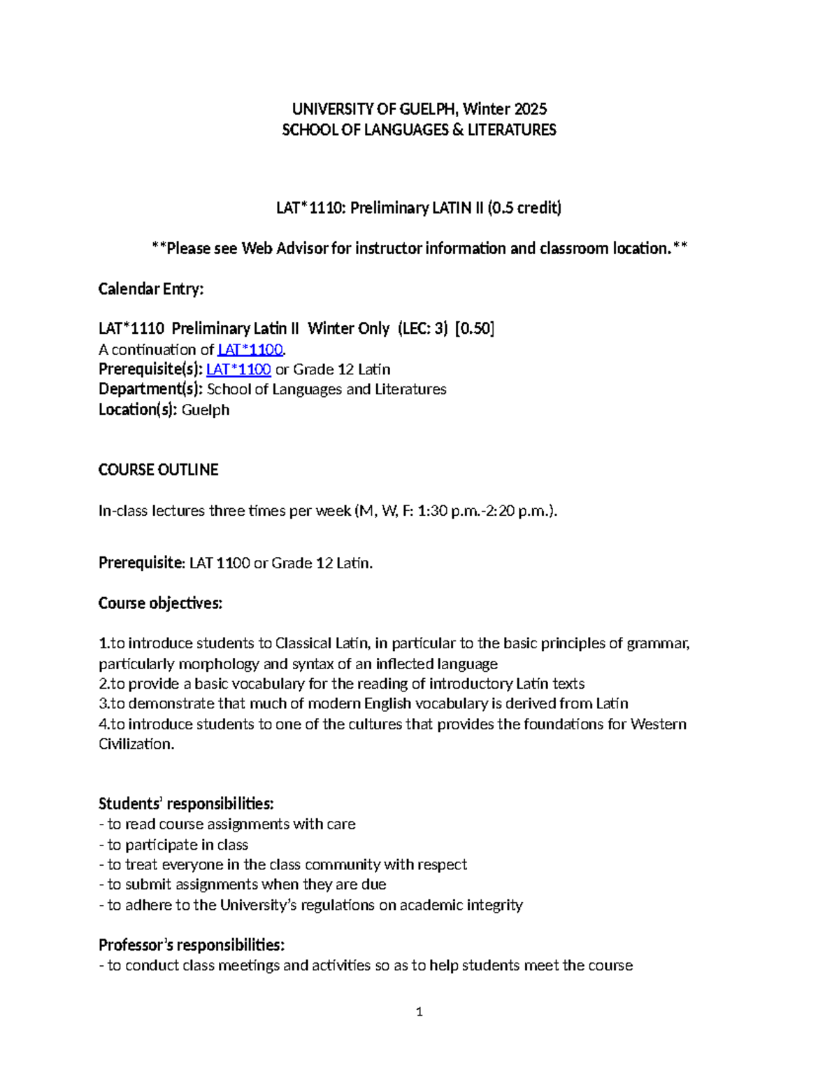 Preliminary Latin II (LAT 1110) Winter 2025 Course Outline - Studocu
