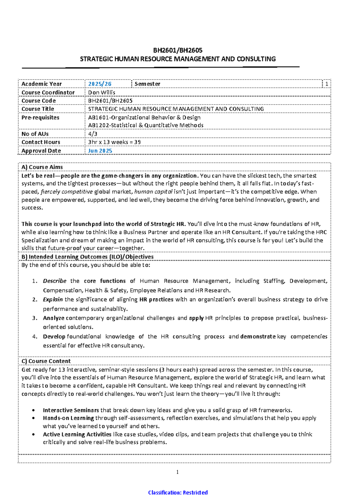 Course Outline: BH2601-BH2605 Strategic HRM & Consulting S1 AY2025 ...