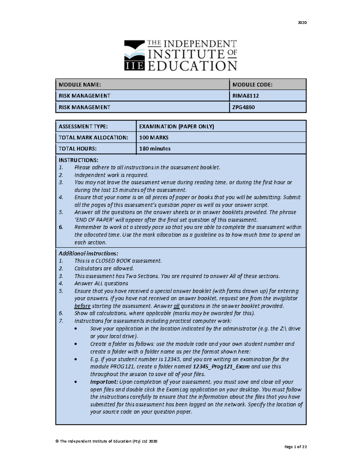 RIMA8112Ea C19 WUS - past paper - © The Independent Institute of ...