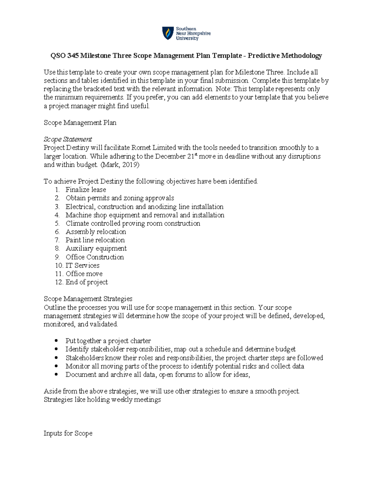 QSO 345 Milestone Three Scope Management Plan Template - Predictive ...