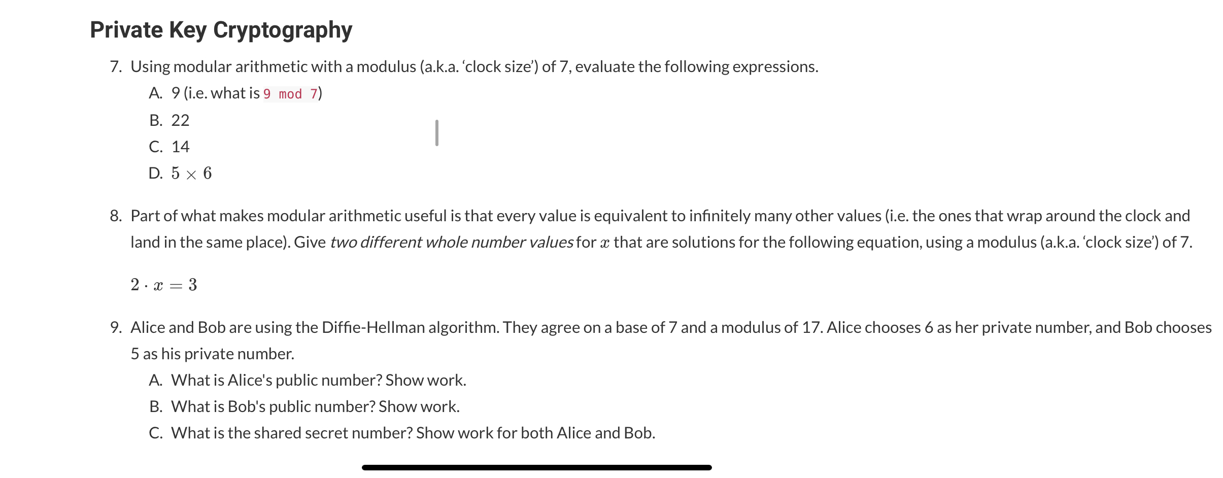 Solved 7. Using modular arithmetic with a modulus (a.k.a. | Chegg.com