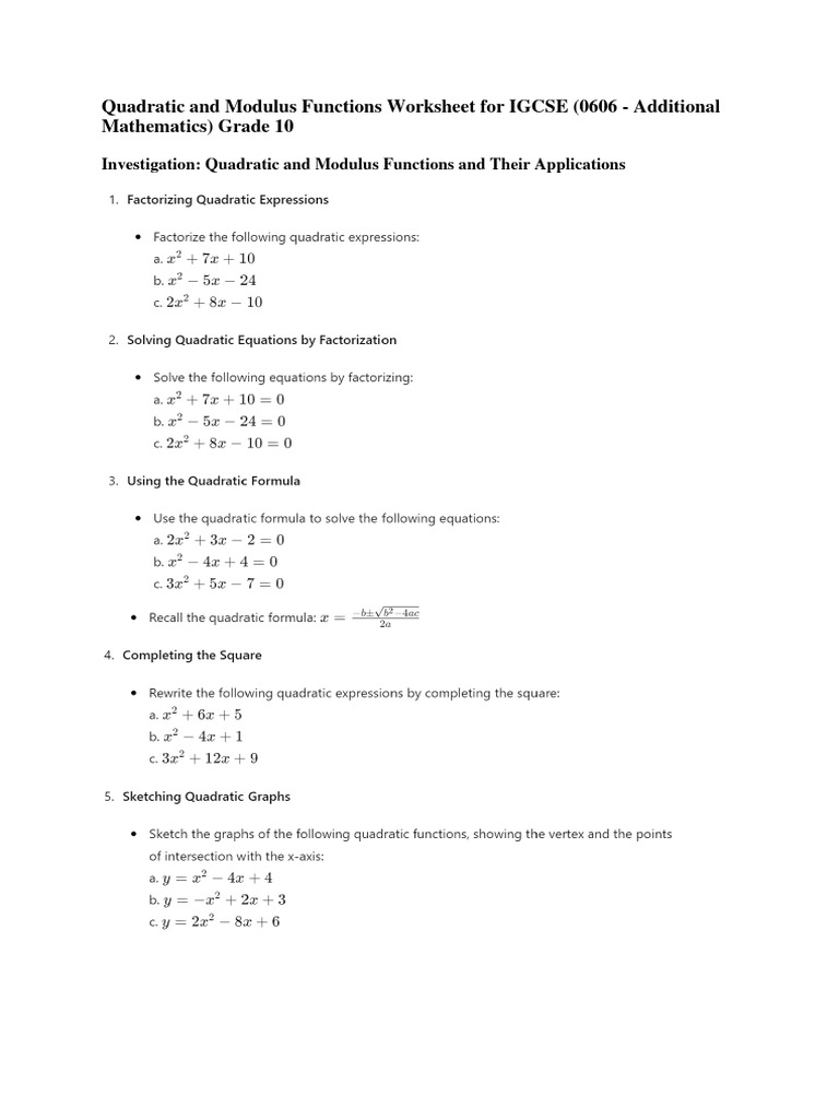 IGCSE Quadratic & Modulus Functions Worksheet | PDF