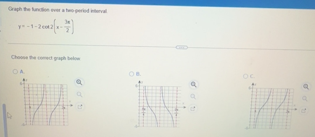 Solved: Graph the function over a two-period interval. y=-1-2cot 2(x ...