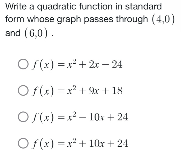 Solved: Write a quadratic function in standard form whose graph passes ...