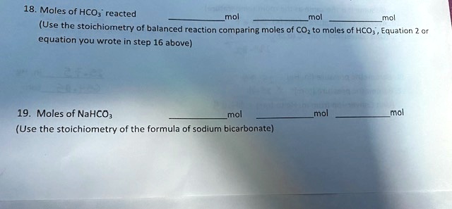 18. Moles of HCO3 reacted mol mol mol (Use the stoichiometry of ...