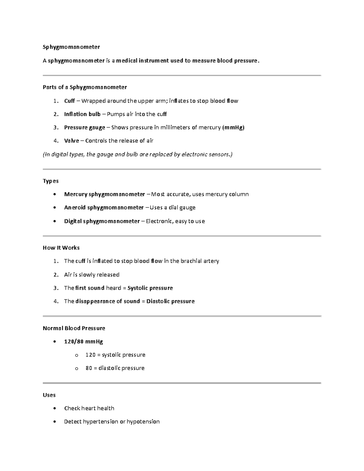 Sphygmomanometer Overview: Types, Parts, and Functionality - Studocu