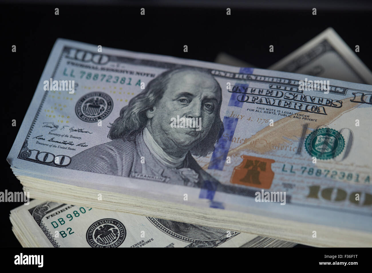 Stack of one hundred dollars bills on wooden desk Stock Photo - Alamy