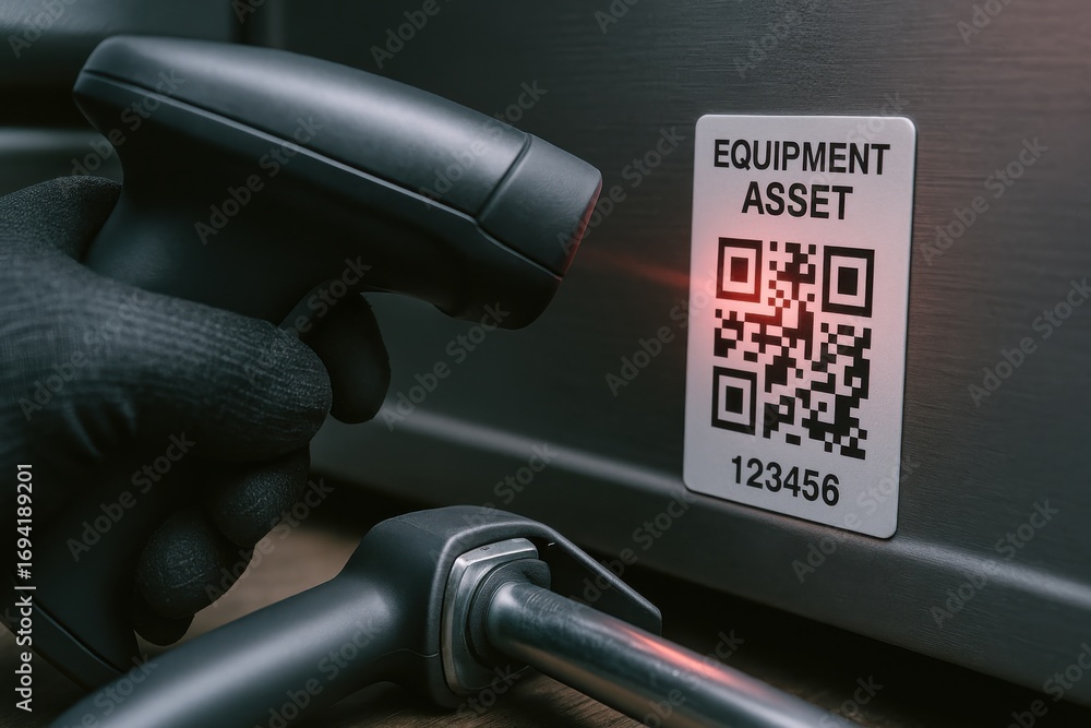 Hand scanning QR code of equipment asset for inventory management ...