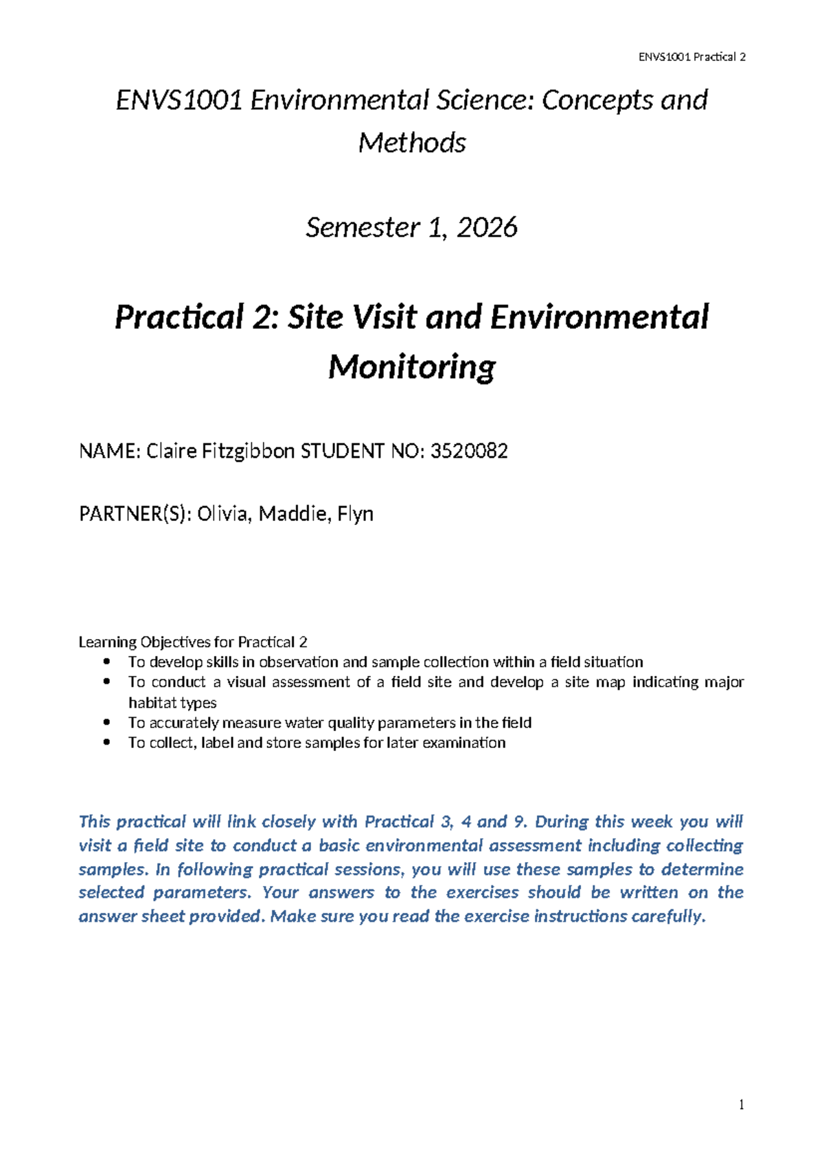 ENVS1001 Practical 2: Site Visit & Environmental Monitoring Guide - Studocu