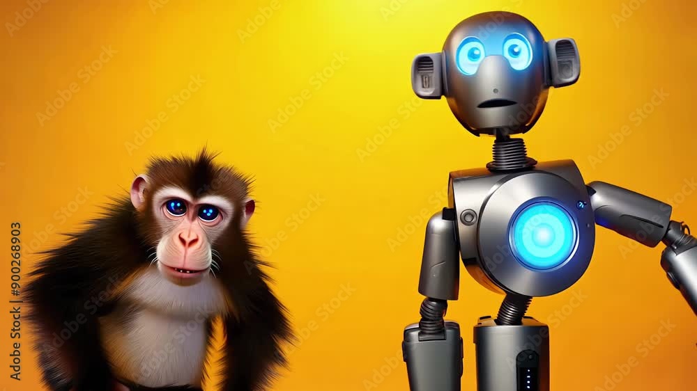 A curious robot and a monkey interacting in a scene that showcases the ...