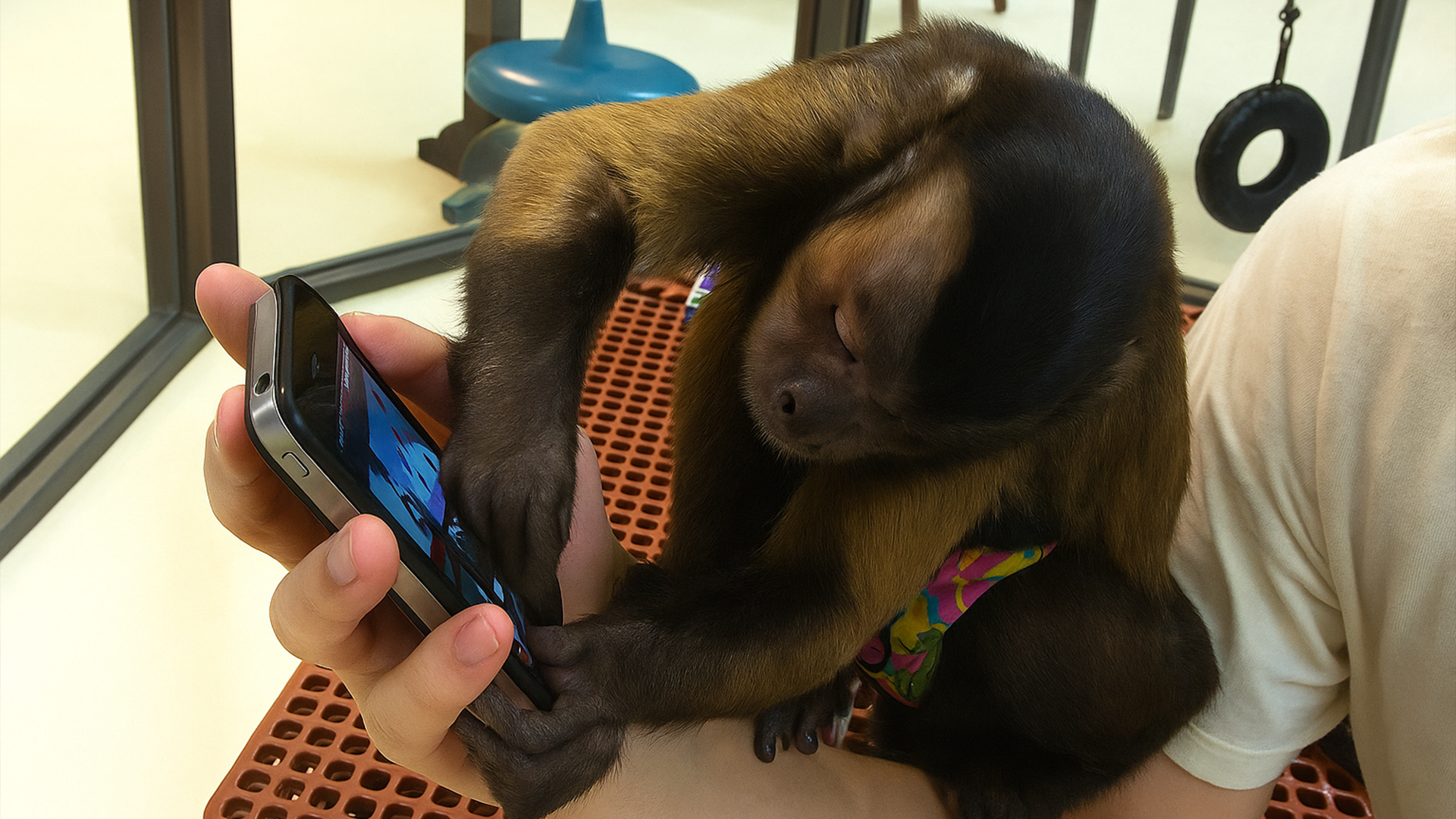 Sidesplitting scene of a monkey trying to figure out a touchscreen ...