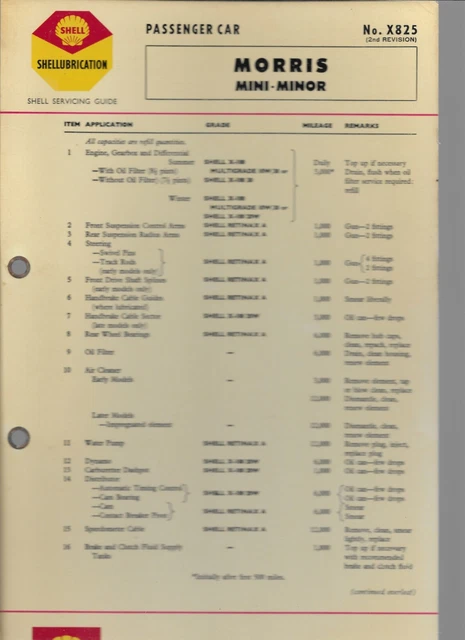 SHELL LUBRICATION CHART Servicing Guide Morris Mini Minor. X825/2 £2.99 ...