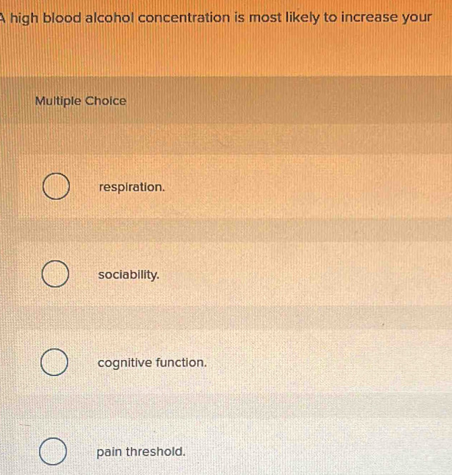 Solved: A high blood alcohol concentration is most likely to increase ...